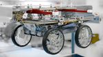 One of three small lunar rovers that are part of a NASA technology demonstration called CADRE (Cooperative Autonomous Distributed Robotic Exploration) is attached to a fixture in a clean room at the agency's Jet Propulsion Laboratory in Southern California on Jan. 29, 2025. Less than two weeks later, the rover had been packed up and shipped off in preparation for launch.