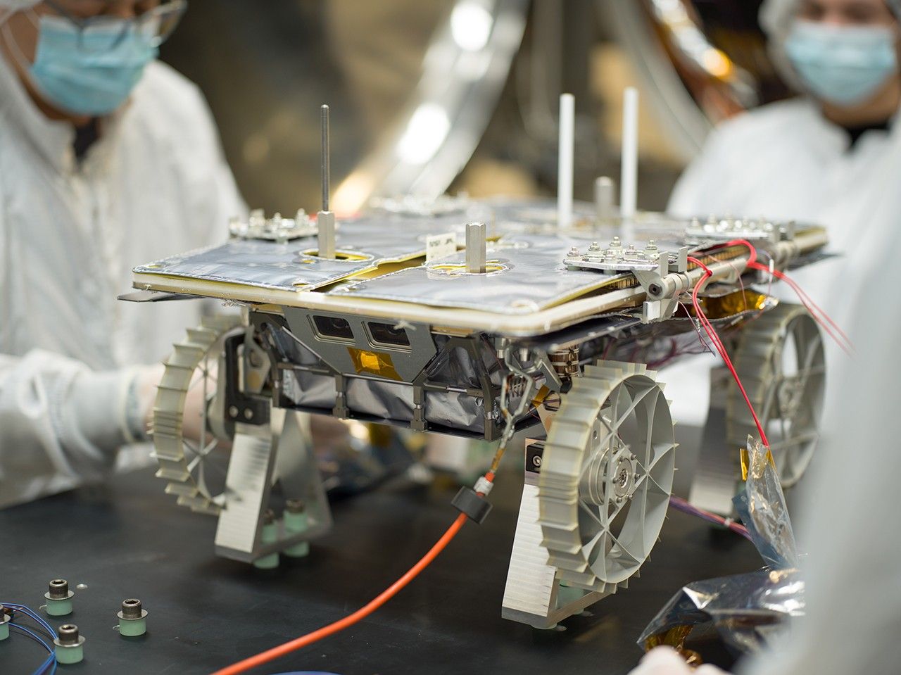 An engineer prepares a small rover – part of NASA's CADRE (Cooperative Autonomous Distributed Robotic Exploration) technology demonstration that's headed to the Moon – for testing in a thermal vacuum chamber at the agency's Jet Propulsion Laboratory in Southern California in October 2023.