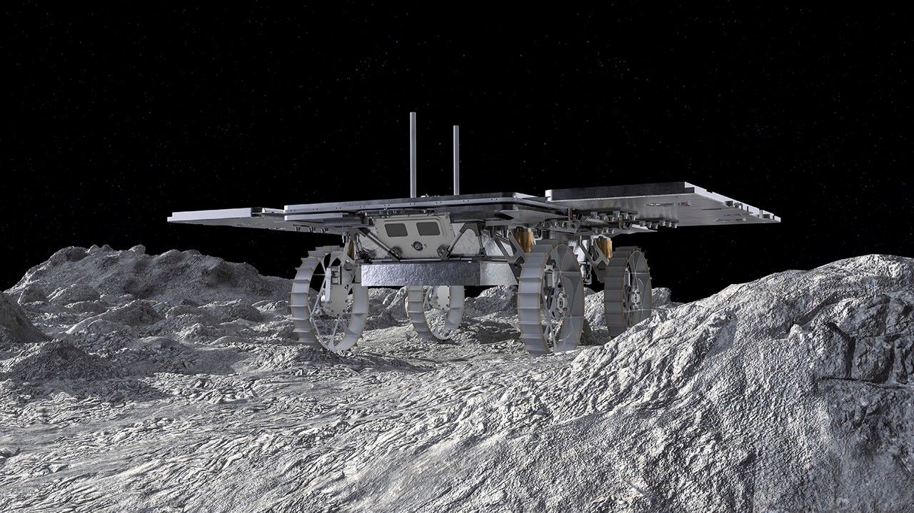 This artist's concept depicts a small rover – part of NASA's CADRE (Cooperative Autonomous Distributed Robotic Exploration) technology demonstration headed for the Moon – on the lunar surface. Motiv Space Systems in Pasadena, California, created the rendering and is collaborating with NASA's Jet Propulsion Laboratory on critical rover and mobility functions.