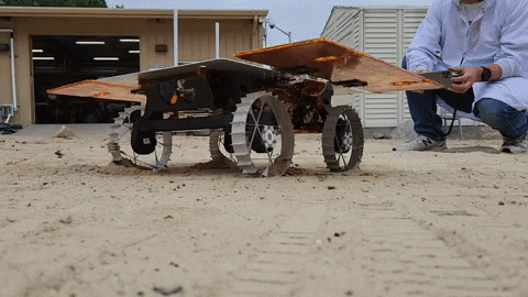 A development model rover that is part of NASA's CADRE (Cooperative Autonomous Distributed Robotic Exploration) technology demonstration took its first autonomous drive around the Mars Yard at the agency's Jet Propulsion Laboratory in Southern California in June 2023. The CADRE team tested a new wheel design, surface navigation software, and mobility capabilities, among other aspects of the project. Engineer Kristopher Sherrill is shown recording video of the test.