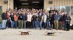 Members of NASA's CADRE (Cooperative Autonomous Distributed Robotic Exploration) technology demonstration team pose with two full-scale development model rovers in the Mars Yard at the agency's Jet Propulsion Laboratory in Southern California in January 2024.