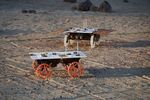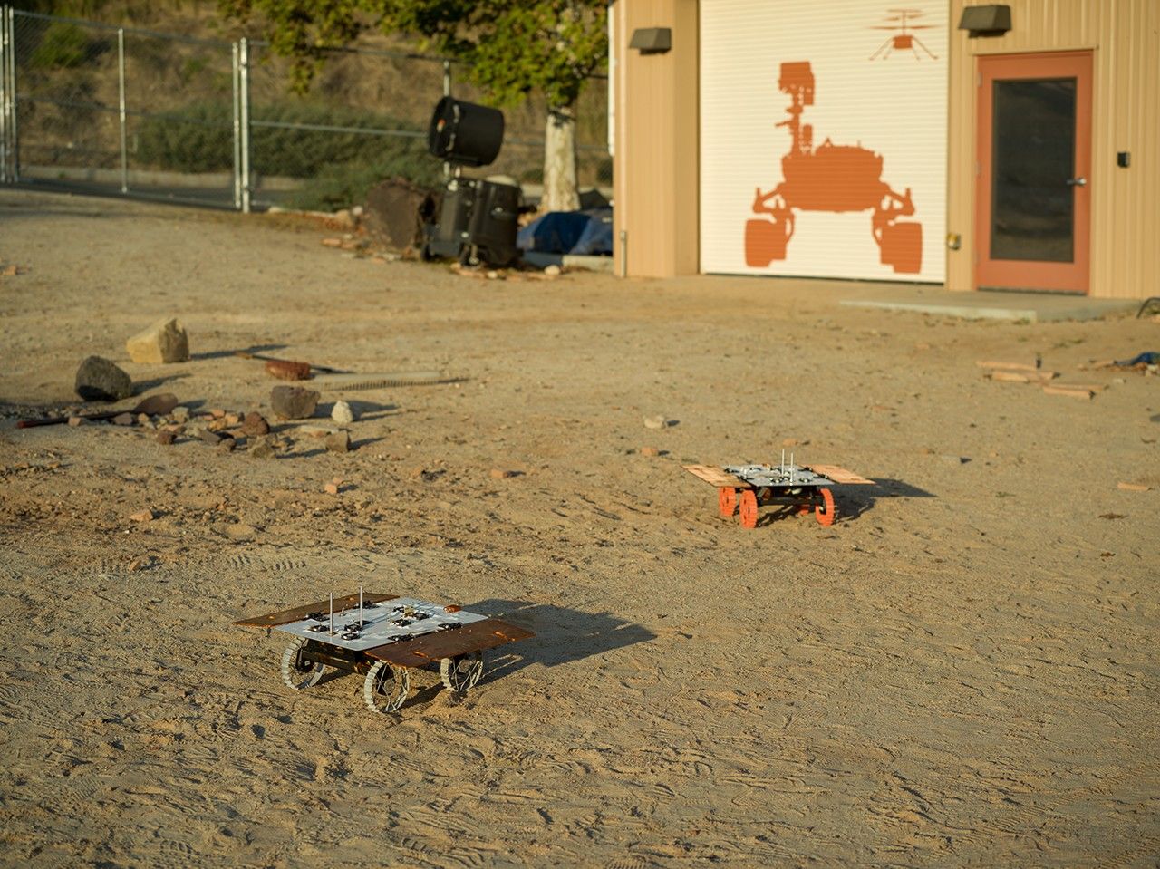 Two full-scale development model rovers that are part of NASA's CADRE (Cooperative Autonomous Distributed Robotic Exploration) technology demonstration drive in the Mars Yard at the agency's Jet Propulsion Laboratory in Southern California in August 2023. The project is designed to show that a group of robotic spacecraft can work together as a team to accomplish tasks and record data autonomously – without explicit commands from mission controllers on Earth.