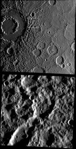 These images highlight the spectacular Vivaldi peak-ring basin and its ejecta blanket. The top image was acquired with MESSENGER's Wide Angle Camera, and the white box shows the location of the bottom image, acquired about a minute later with the Narrow Angle Camera. While Vivaldi is stunning, the real purpose of these images was to check and improve the geometric calibration of the cameras. As light passes through the lenses of a camera, it bends such that subtle geometric distortions of the scene occur, and for the Wide Angle Camera things like the focal length can shift by small amounts depending on which filter is being used. These images were part of a series that is designed to make sure we can map each pixel of the NAC and WAC to a geographic latitude and longitude as accurately as possible, and that the coordinates from the two cameras match perfectly. The two images shown here are also a good reminder of just how much higher resolution the NAC provides compared to the WAC.