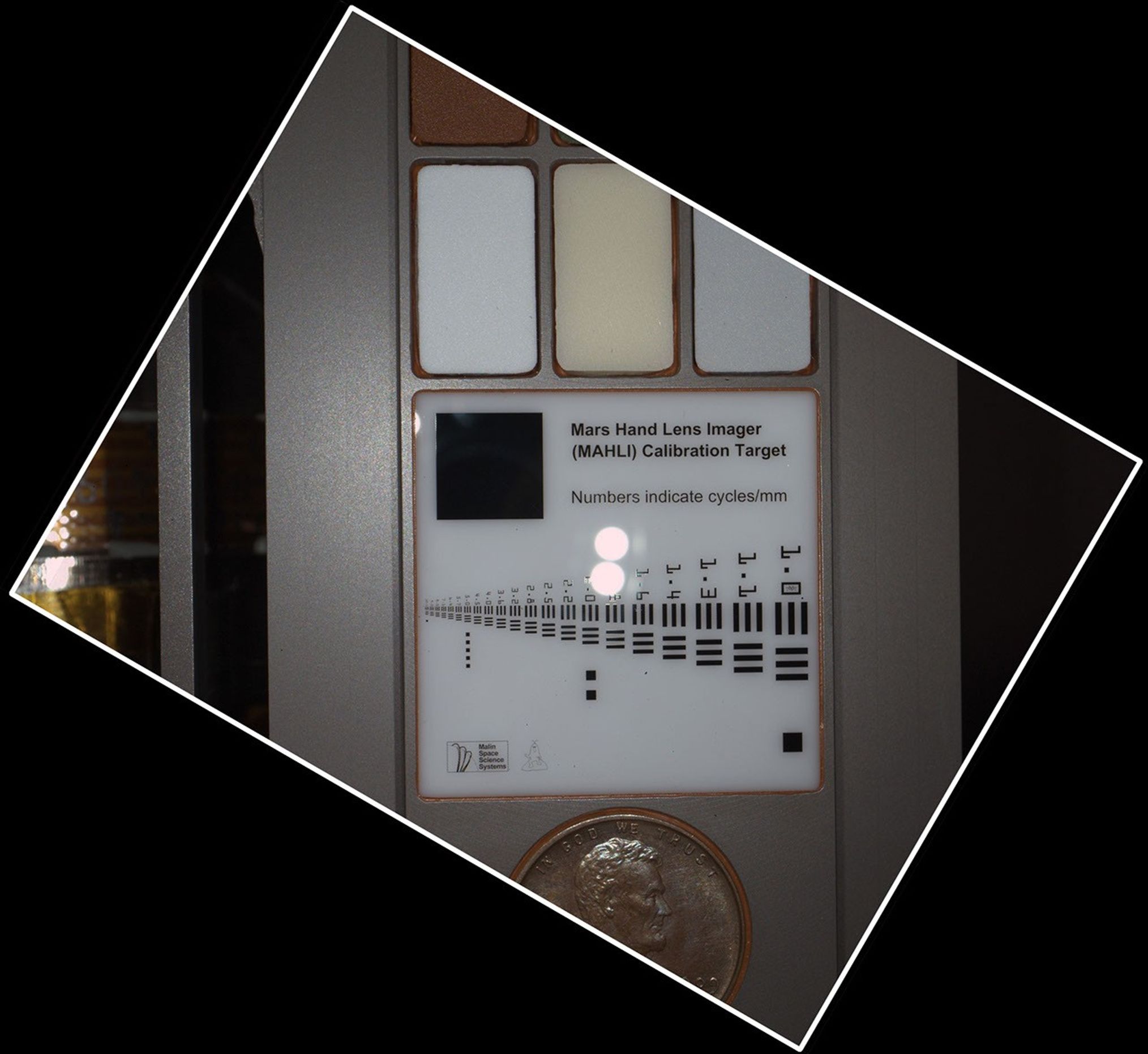 Including a Lincoln penny on the calibration target is a nod to geologists' tradition of placing a coin as a size reference in close-up photographs of rocks. It gives the public a familiar object for perceiving size easily.