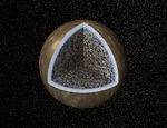Callisto's cratered surface lies at the top of an ice layer, (depicted here as a whitish band), which is estimated to be about 200 kilometers (124 miles) thick. Immediately beneath the ice, the thinner blue band represents the possible ocean, whose depth must exceed 10 kilometers (6 miles), according to scientists studying data from Galileo's magnetometer. The mottled interior is composed of rock and ice.