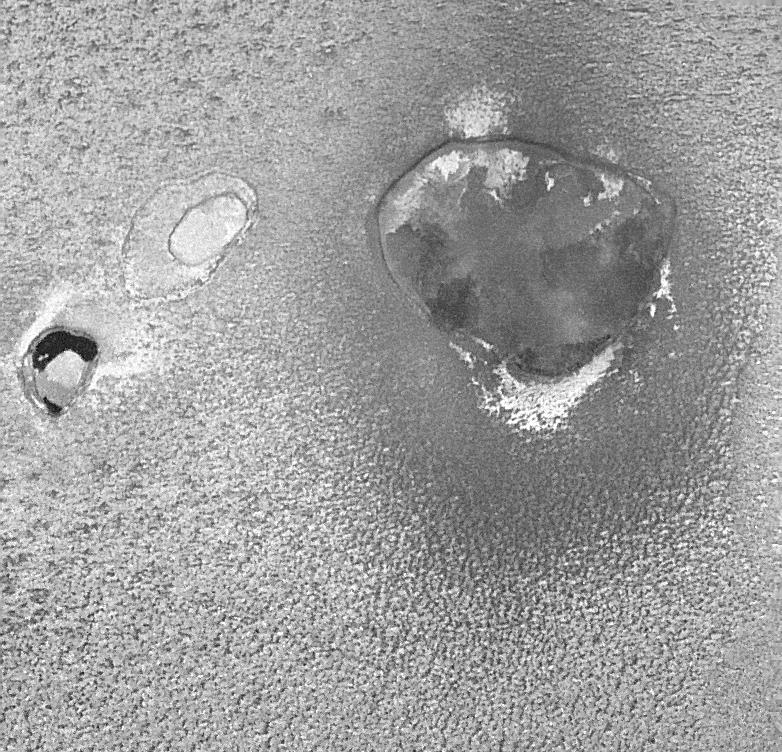 Two smaller paterae, which are unnamed, are to the left (west) of Camaxtli. One has very dark, very fresh lava on the floor and is hotter than the larger Camaxtli Patera because it is erupting lava at a faster rate. The other is comparatively bright, like the surrounding plains. This implies that the volcanism here has been dormant for long enough that snow and frost have covered the lava flows.