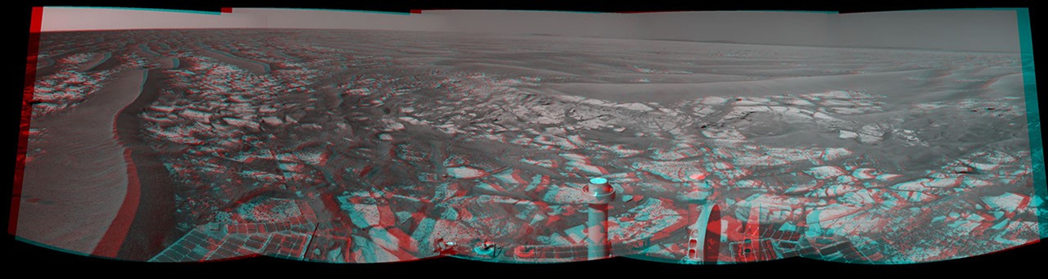 Opportunity used its navigation camera during the 2,335th Martian day, or sol, of the rover's mission on Mars (Aug. 18, 2010) to take these images. Science instruments on the robotic arm were used to measure the chemistry and texture of the outcrop from Sol 2340 (Aug. 24, 2010) to Sol 2346 (Aug. 30, 2010). Opportunity has since resumed its journey toward the long-term destination of Endeavour Crater. Portions of Endeavour Crater's rim are visible on the horizon. This image combines exposures from the left eye and the right eye of the navigation camera to provide a three-dimensional effect.