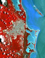 Cancun is a resort city on the east side of Mexico's Yucatan Peninsula. In 1970, the population was 120 people. The city began as a tourism project in 1974. Since then, it has undergone a comprehensive transformation from being a fisherman's island surrounded by virgin forest and undiscovered shores to being one of the two most well-known Mexican resorts, along with Acapulco. In 1990 the city had grown to 167,000 inhabitants, and by 2014 to 723,000 inhabitants. These two images show the area on March 28, 1985, acquired by Landsat; and May 14, 2014, acquired by ASTER. The images cover an area of 25 x 36 km, and are located at 21.1 degrees north, 86.8 degrees west.