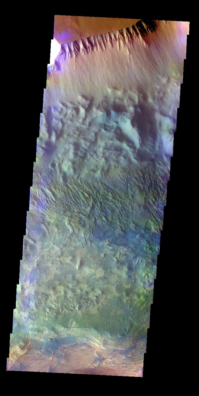 The THEMIS VIS camera contains 5 filters. The data from different filters can be combined in multiple ways to create a false color image. These false color images may reveal subtle variations of the surface not easily identified in a single band image. Today's false color image shows part of the northern wall of Candor Chasma.