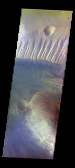 The THEMIS camera contains 5 filters. The data from different filters can be combined in multiple ways to create a false color image. These false color images may reveal subtle variations of the surface not easily identified in a single band image. Today's false color image shows part of Candor Chasma. The bright tones in this image are the canyon walls, the bluer material is sand and other debris on the canyon floor.