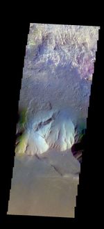 The THEMIS VIS camera contains 5 filters. The data from different filters can be combined in multiple ways to create a false color image. These false color images may reveal subtle variations of the surface not easily identified in a single band image. Today's false color image shows part of Candor Chasma. There is a landslide deposit from the rim of the chasma.