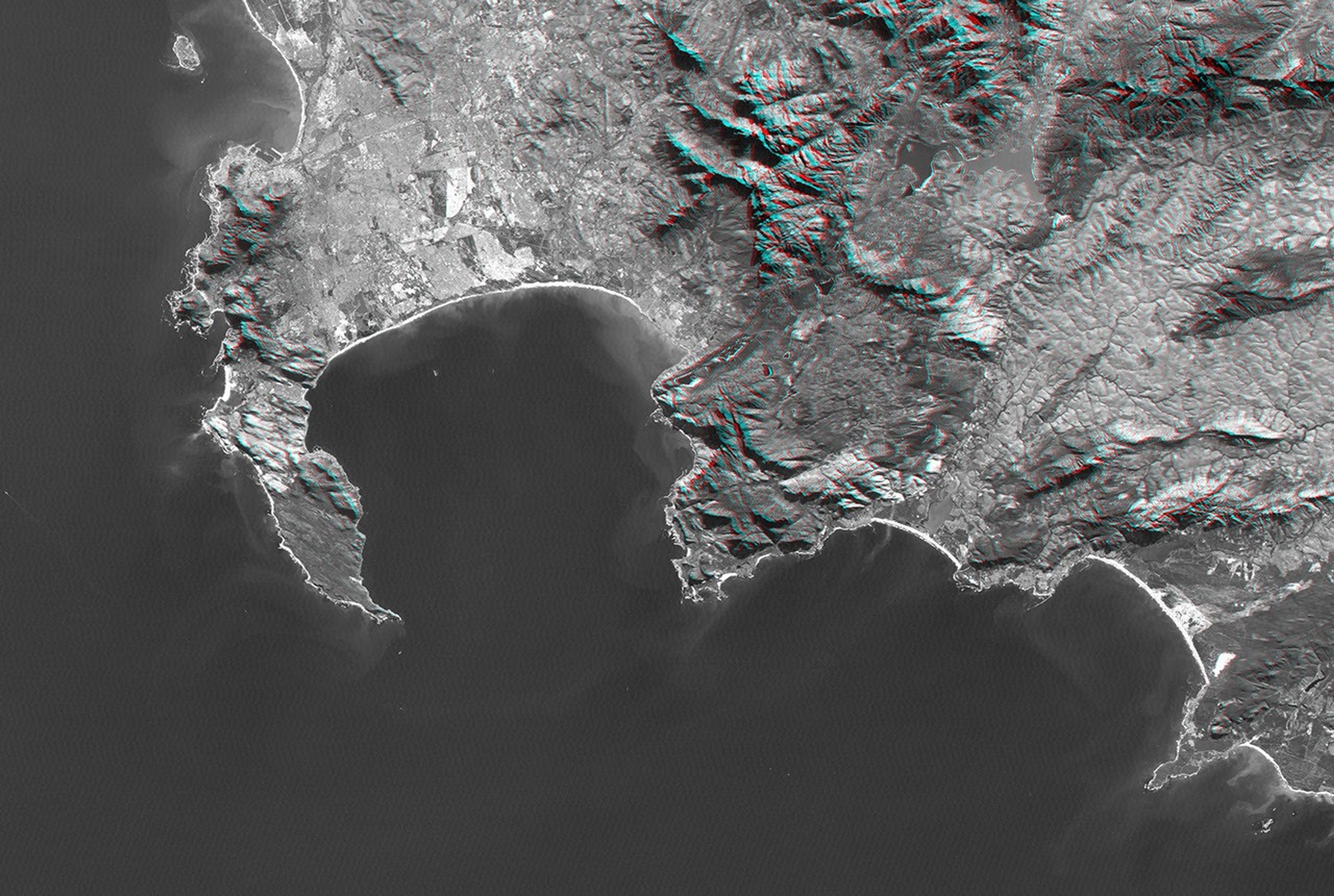 Cape Town and the Cape of Good Hope, South Africa, appear on the left (west) of this anaglyph view generated from a Landsat satellite image and elevation data from the Shuttle Radar Topography Mission (SRTM). The city center is located between Table Bay (upper left) and Table Mountain (just to the south), a 1,086-meter (3,563-foot) tall sandstone and granite natural landmark.