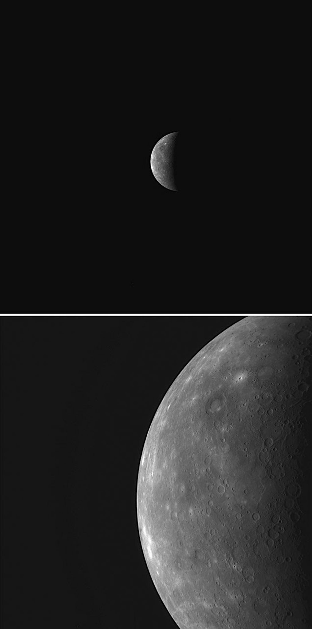 MESSENGER captured these two images of an approaching Mercury just 41 seconds apart. The top image was taken by the WAC, while the bottom image was acquired by the NAC. The dual cameras provide complementary imaging data sets, both valuable for understanding the nature of Mercury's surface. The NAC is higher in resolution than the WAC by a factor of seven and is used to see the details of geologic features. Examples of such geologic features newly discovered in NAC images returned from Mercury flyby 3 include troughs on the floor of a large basin, a pit-floor crater, and an irregularly shaped bright depression. The WAC is equipped with eleven narrow-band color filters, which can be used to createenhanced-color images that highlight differences in the composition ofrocks on Mercury's surface. Enhanced-color images from the first two flybys have been used to map Mercury's crust. Currently, MESSENGER Science Team members are preparing similar enhanced-color views from the WAC images obtained during Mercury flyby 3.