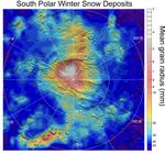 Deposits of small particles of carbon-dioxide ice are formed by snowfall from carbon-dioxide clouds. This map shows the distribution of small-grain carbon-dioxide ice deposits formed by snowfall over the south polar cap of Mars. It is based on infrared measurements by the Mars Climate Sounder instrument on the Mars Reconnaissance Orbiter.