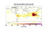 These images made with data acquired by AIRS, the Atmospheric Infrared Sounder on NASA's Aqua Satellite, show the global concentration of carbon monoxide at the 500hPa pressure level, or approximately 18,000 feet (5,500 meters) altitude. The data are an average of measurements taken over three days, from October 14 through 16, and October 26 through 28, and the high concentration and large extent of the fires over Indonesia are quite apparent. While the scale for this image extends to 400 parts per billion, local values of carbon monoxide can be significantly higher.