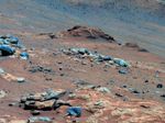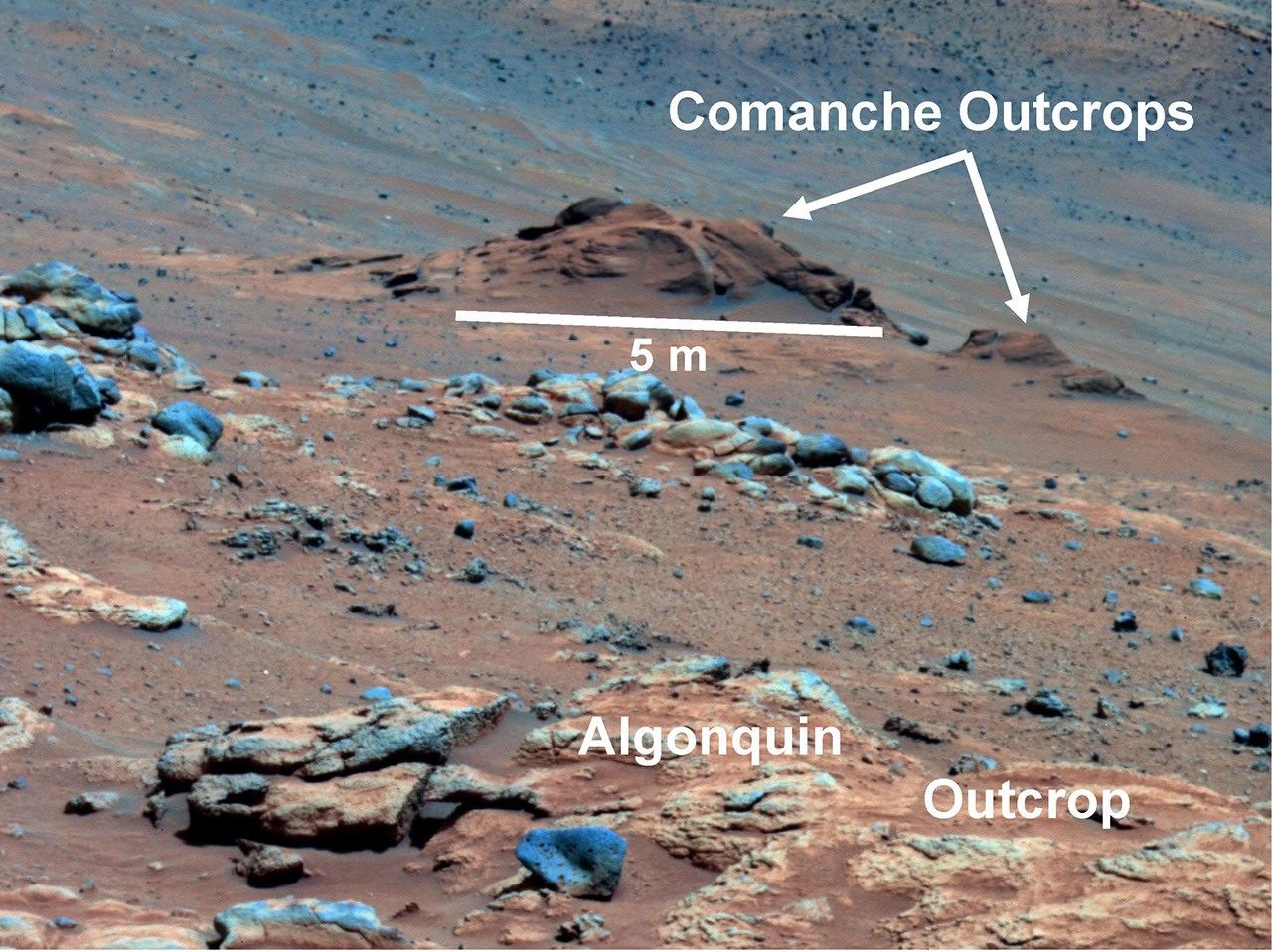 In this image, Comanche is the dark reddish mound above the center of the view. The image is presented in false color, which makes some differences between materials easier to see. It combines three separate exposures taken through filters admitting wavelengths of 750 nanometers, 530 nanometers and 430 nanometers. The main Comanche outcrop is about 5 meters (16 feet) from left to right from this perspective. The paler material visible at bottom right is part of another outcrop, "Algonquin."