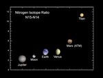 This graph shows data acquired by Cassini as it flew by Titan at an altitude of 1,200 kilometers (745 miles) on Oct. 26, 2004 - its closet approach yet to the hazy moon. The data is from Cassini's ion and neutral mass spectrometer, which detects charged and neutral particles in the atmosphere. The graph shows that the amount of light nitrogen in the atmosphere of Titan is much less than that around other planets. Scientists believe this nitrogen was lost over large geologic times scales for reasons that remain unknown.