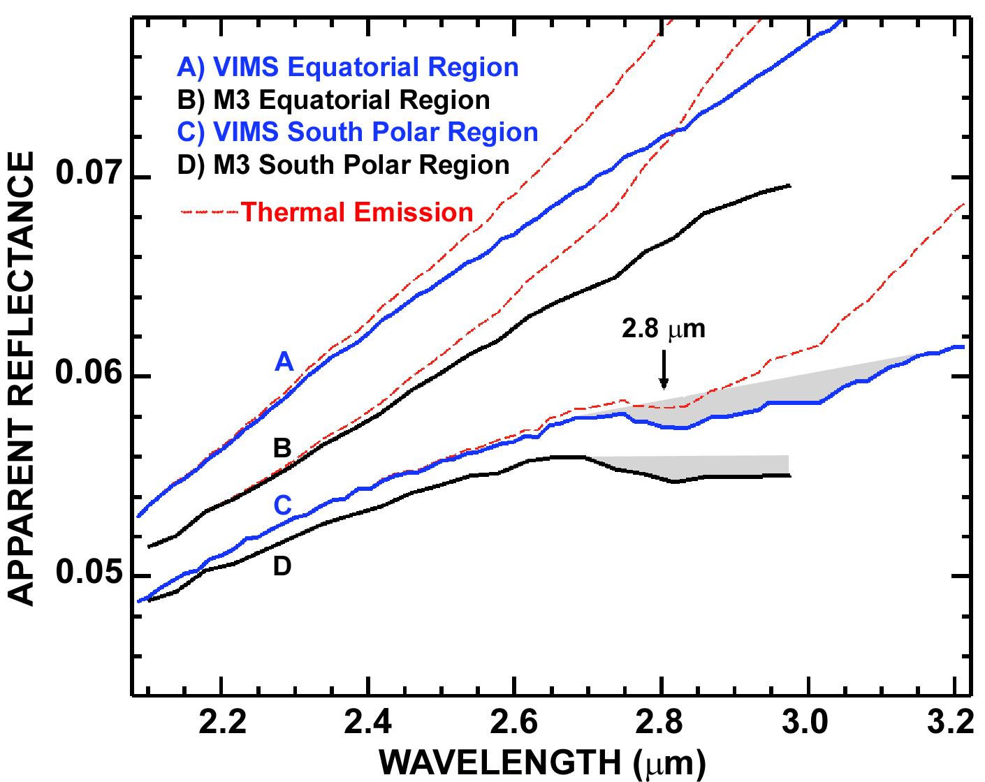 The agreement between the two spacecraft is an excellent confirmation of the existence of water and hydroxyl (gray regions on the graph where wavelengths of infrared light range from 2.7 to 3.2 micrometers).