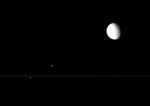 The Cassini spacecraft's views from edge-on with the rings are perfect for capturing multiple Saturnian moons grouped closely.