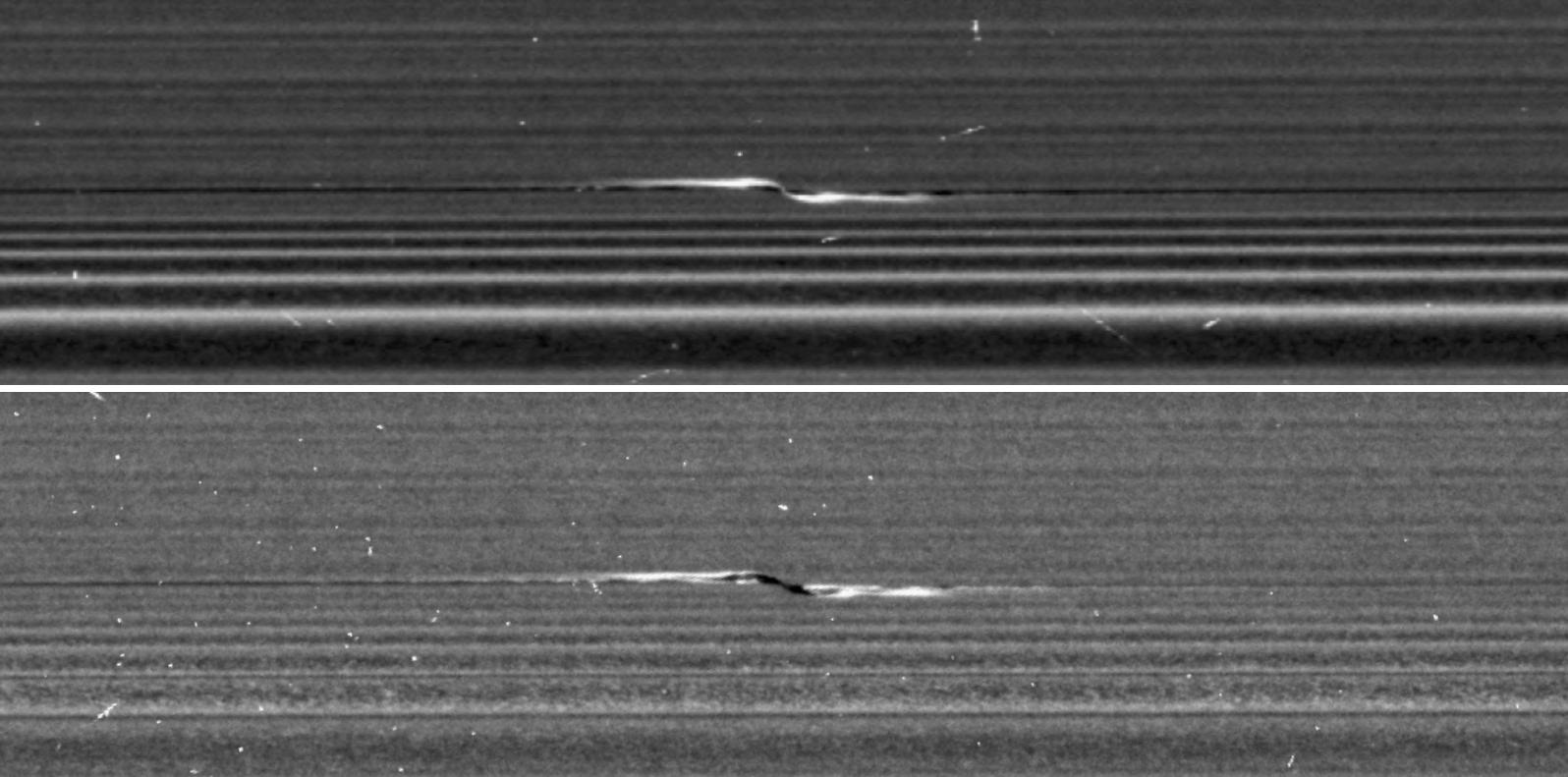 This observation was Cassini's first targeted flyby of a propeller. The views show the object from vantage points on opposite sides of the rings. The top image looks toward the rings' sunlit side, while the bottom image shows the unilluminated side, where sunlight filters through the backlit ring.