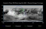 This map of Titan's surface illustrates the regions that will be imaged by Cassini during the spacecraft's close flyby of Titan on Aug. 22, 2005. At closest approach, the spacecraft is expected to pass approximately 3,800 kilometers (2,360 miles) above the moon's surface. At 5,150 kilometers (3,200 miles) across, Titan is one of the solar system's largest moons.