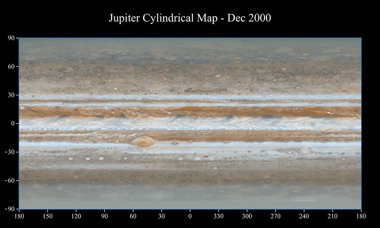 These color maps of Jupiter were constructed from images taken by the narrow-angle camera onboard NASA's Cassini spacecraft on Dec. 11 and 12, 2000, as the spacecraft neared Jupiter during its flyby of the giant planet. Cassini was on its way to Saturn. They are the most detailed global color maps of Jupiter ever produced. The smallest visible features are about 120 kilometers (75 miles) across.