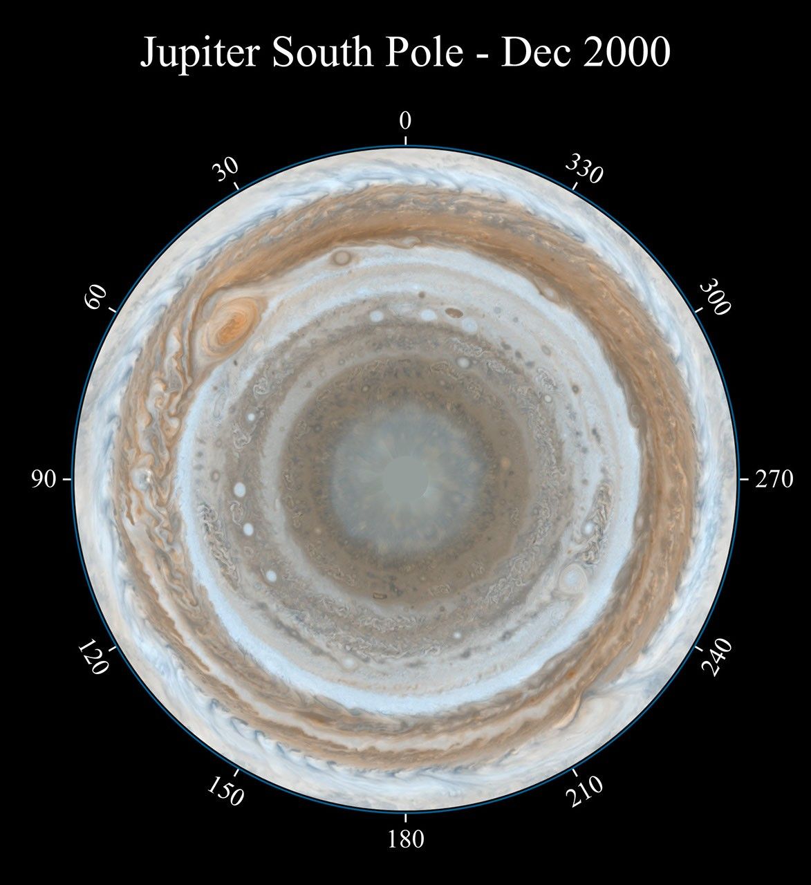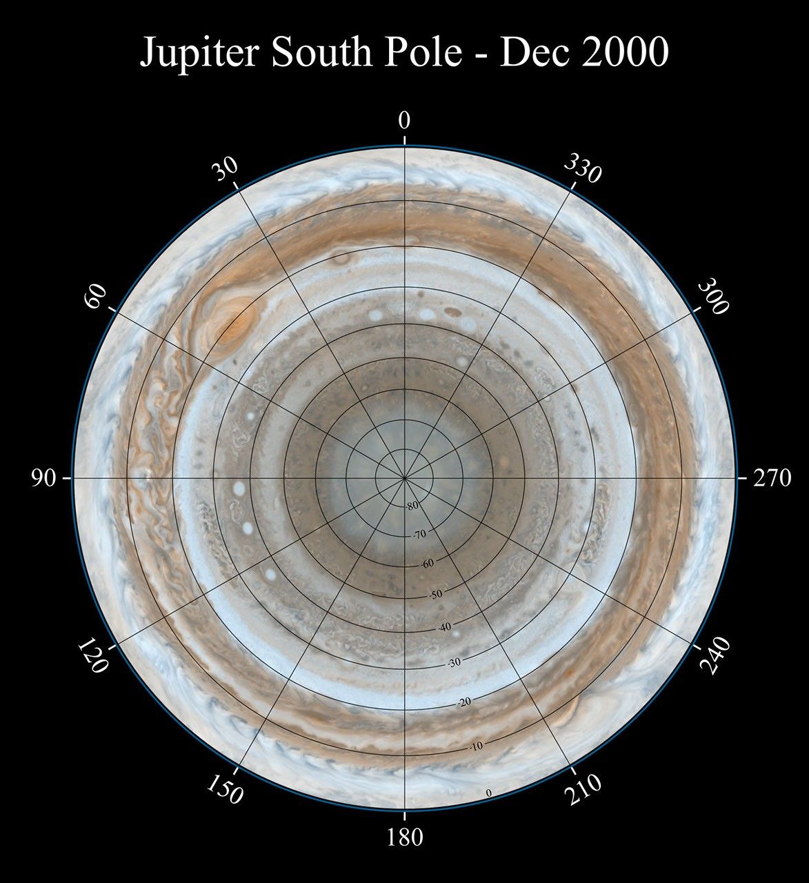These color maps of Jupiter were constructed from images taken by the narrow-angle camera onboard NASA's Cassini spacecraft on Dec. 11 and 12, 2000, as the spacecraft neared Jupiter during its flyby of the giant planet. Cassini was on its way to Saturn. They are the most detailed global color maps of Jupiter ever produced; the smallest visible features are about 120 kilometers (75 miles) across. For other maps see PIA07782 and PIA07783.