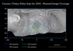 This map of the surface of Saturn's moon Tethys illustrates the regions that will be imaged by Cassini during the spacecraft's close flyby of the moon on Sept. 24, 2005. At closest approach, the spacecraft is expected to pass approximately 1,500 kilometers (930 miles) above the moon's surface. Tethys is 1,071 kilometers (665 miles) across.