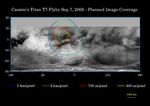 This map of Titan's surface illustrates the regions that will be imaged by Cassini during the spacecraft's close flyby of Titan on Sept. 7, 2005. At closest approach, the spacecraft is expected to pass approximately 1,075 kilometers (670 miles) above the moon's surface. This is Cassini's eighth flyby of Titan out of 45 flybys planned in the four-year tour.
