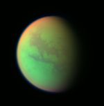 It was created by combining two infrared images (taken at 938 and 889 nanometers) with a visible light image (taken at 420 nanometers). Green represents areas where Cassini is able to see down to the surface. Red represents areas high in Titan's stratosphere where atmospheric methane is absorbing sunlight. Blue along the moon's outer edge represents visible violet wavelengths at which the upper atmosphere and detached hazes are better seen.