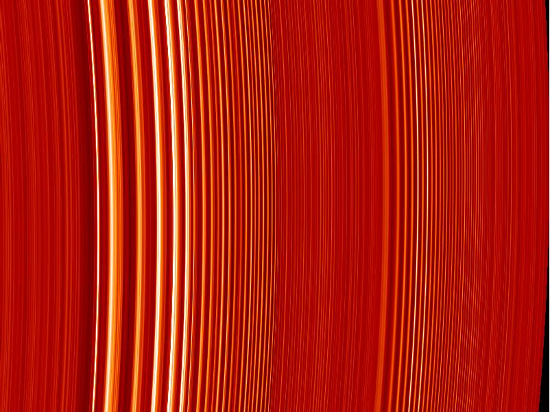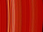 This false color image of two density waves in Saturn's A ring was made from the stellar occultation observed by Cassini's ultraviolet imaging spectrograph when the spacecraft was 6.3 million kilometers (4 million miles) from Saturn.