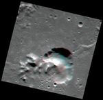 With your red-cyan glasses on, check out this stereo view inside the complex crater Catullus. Here you can see the central peaks rising above the relatively smooth floor of the crater. To the right of the peaks, a large, irregularly shaped pit sinks down below the level of the crater floor. This pit may have formed due to past volcanic activity within the impact crater.