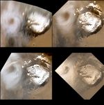 The four pictures shown here provide an example of one of the weather phenomena that repeat each martian year. Each picture shows the north polar region of Mars during the northern summer season. Each picture is a composite of several images acquired at different visible wavelengths to give a color view of the planet. Each picture was taken about 1 Mars year apart, and each shows an annular (circular) cloud located over the same terrain each summer.