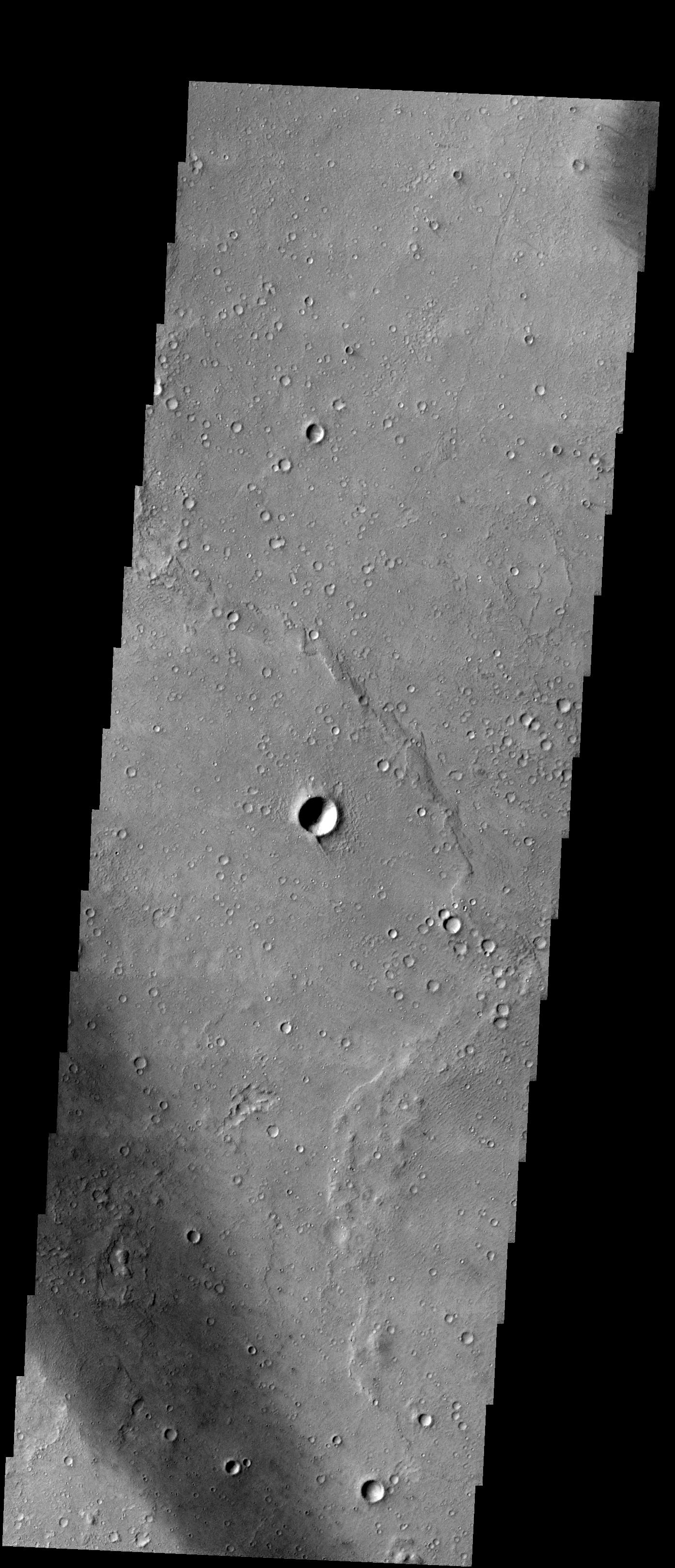 Note: this THEMIS visual image has not been radiometrically nor geometrically calibrated for this preliminary release. An empirical correction has been performed to remove instrumental effects. A linear shift has been applied in the cross-track and down-track direction to approximate spacecraft and planetary motion. Fully calibrated and geometrically projected images will be released through the Planetary Data System in accordance with Project policies at a later time.