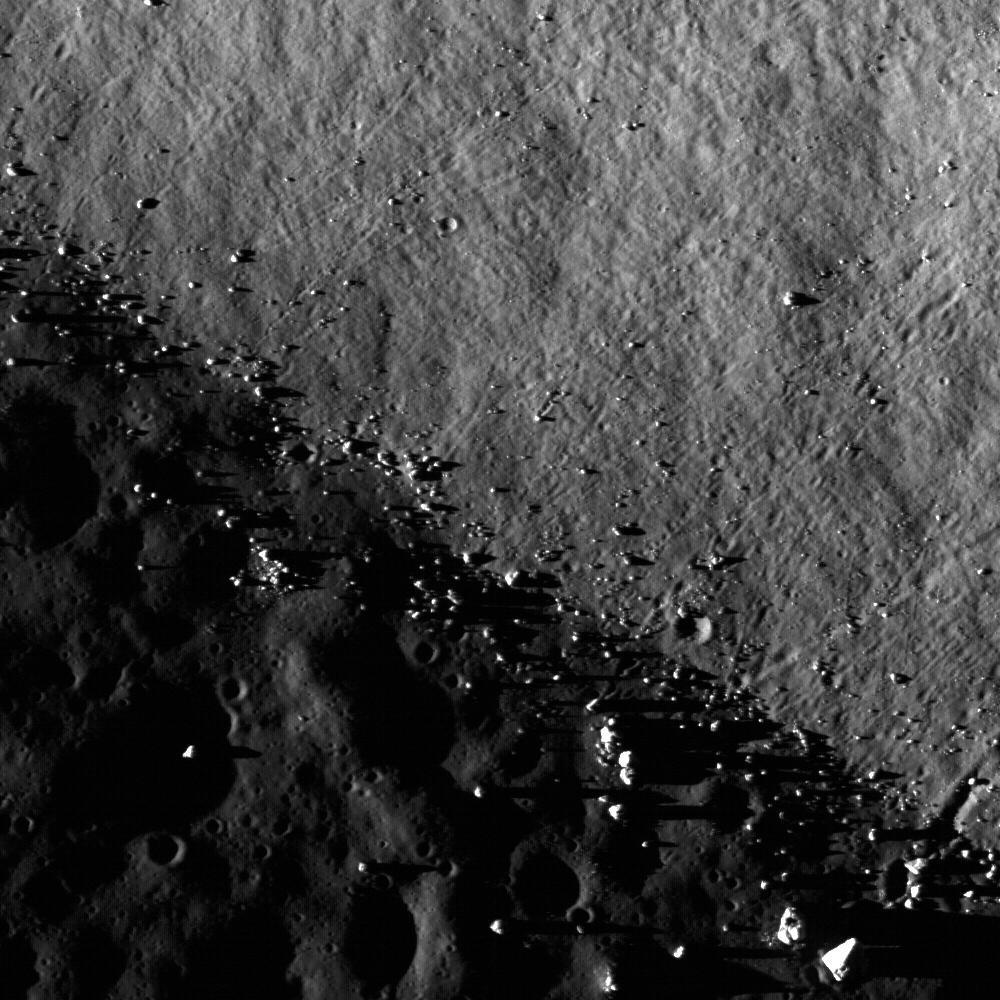 The central peak of Tsiolkovskiy crater is surrounded with mare basalt. This NAC frame shows where boulders rolled down the central peak and onto the mare basalt (note the boulder trails). The central peaks of larger lunar craters like Tsiolkovskiy are of particular scientific interest, because they expose rocks uplifted from great depth during the impact process. This image is 890 meters, or 2919 feet, wide with an incidence angle of 88°.