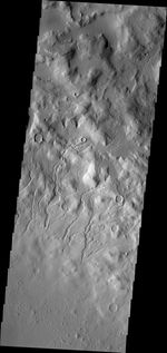 Note: this THEMIS visual image has not been radiometrically nor geometrically calibrated for this preliminary release. An empirical correction has been performed to remove instrumental effects. A linear shift has been applied in the cross-track and down-track direction to approximate spacecraft and planetary motion. Fully calibrated and geometrically projected images will be released through the Planetary Data System in accordance with Project policies at a later time.