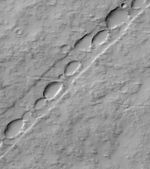 Pavonis Mons is the middle of the three large Tharsis Montes volcanoes in the martian western hemisphere. Located on the equator at about 113°W longitude, Pavonis Mons stands as much as 7 kilometers (4 miles) above the surrounding plain. The Mars Global Surveyor (MGS) Mars Orbiter Camera (MOC) recently spied the above chain of elliptical pits on the lower east flank of Pavonis Mons. The picture covers an area 3 kilometers (1.9 miles) wide by 3.4 kilometers (2.1 miles) in length. The pits are aligned down the center of a 485 meters-(530 yards)-wide, shallow trough. The straight trough and the pits were both formed by collapse associated with faulting. The scarp on each side of the trough is a fault line--troughs of this type are known to geologists as graben. Such features are typically formed when the ground is being moved apart by tectonic forces, or when the ground is uplifted by molten rock injected into the near sub-surface from deeper underground. Both processes may be contributing to the features seen on Pavonis Mons. The pits follow the trend of these faults, and indicate the locus of collapse. Illumination is from the upper left in this image.