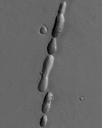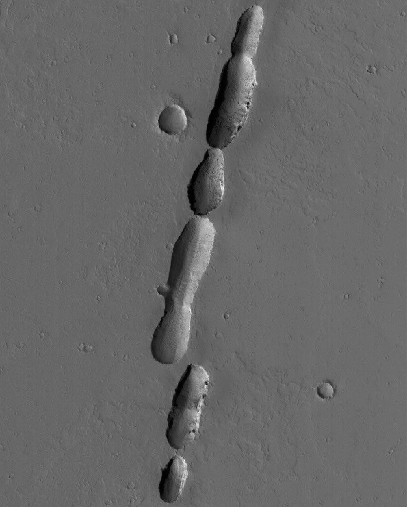 This Mars Global Surveyor (MGS) Mars Orbiter Camera (MOC) image shows a chain of pits associated with dust-covered lava flows in northern Tharsis. The pits formed along a fault; some of the flows may have erupted along this same fault.