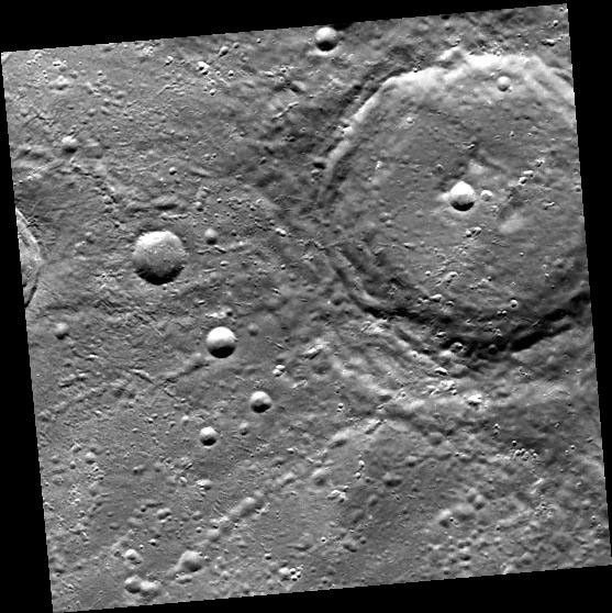 This unnamed complex crater in Mercury's northern hemisphere has produced crater chains. These chains form when a crater ejects material that then plummets towards the surface, producing more craters, often in long linear chains. Another set of crater chains can be seen within the large crater in this image, which most likely originated from the crater Hokusai. Since Hokusai's crater chains lie on top of the crater in this image, the crater Hokusai must be younger!