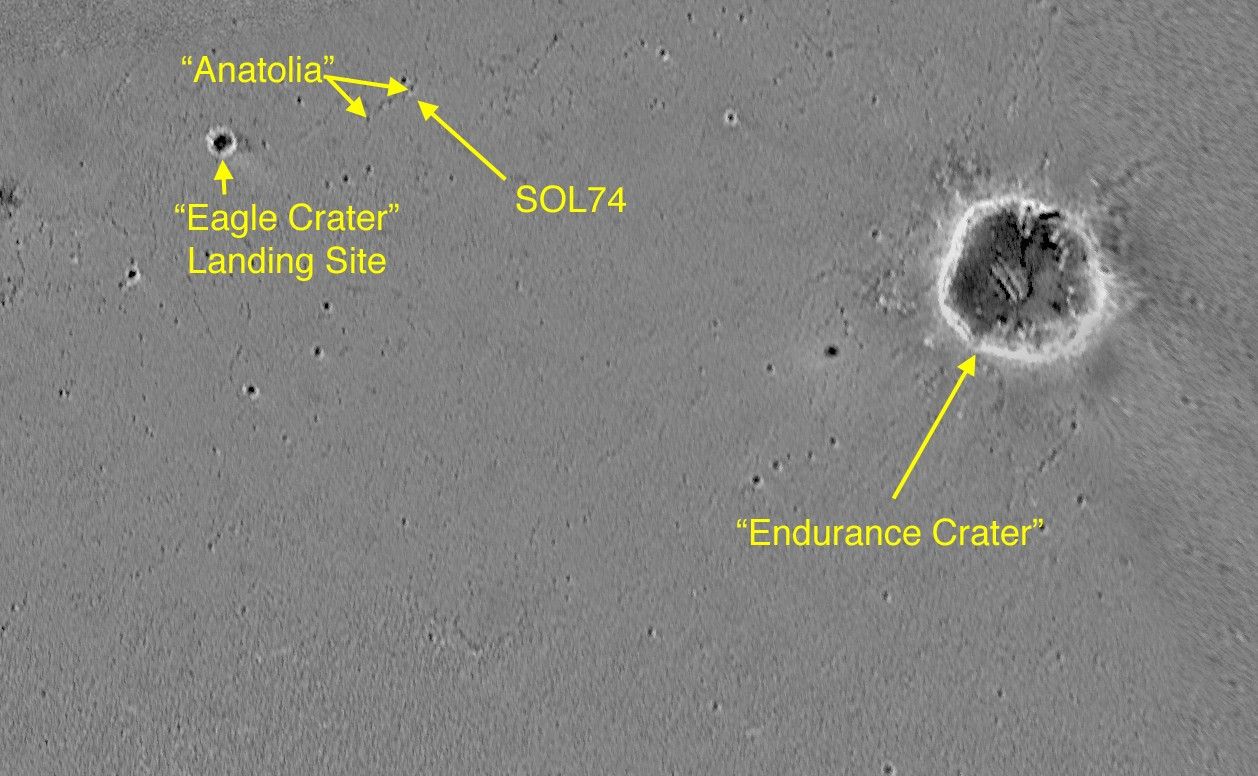 This map highlights the past and future stomping grounds of the Mars Exploration Rover Opportunity. "Eagle Crater" is the small crater where the rover landed over two months ago. "Anatolia," named after the Anatolian fault system in Turkey, is the trough the rover is currently investigating. "Endurance" is the large crater the rover will travel toward in coming sols. The underlying image was taken by the camera onboard the Mars Global Surveyor orbiter.