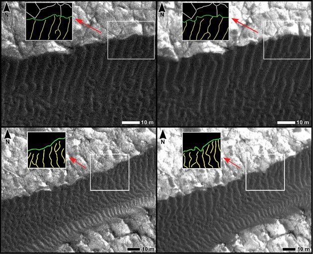 The two images on the left are excerpts from a June 30, 2007, observation (late autumn at the site). The two on the right are of the same ground observed 15 weeks later, on Oct. 13, 2007 (winter at the site). Dark dunes overlaid with smaller ripples fill the bottom of the upper pair and cross the middle of the lower pair. In each image, an inset box in the upper left holds a diagram of the ripple crests (yellow lines) and dune edges (green lines) within the inscribed box to the right of the diagram. Changes both in the dune edges and in the ripple crests occurred during the interval between the June observation and the October observation.