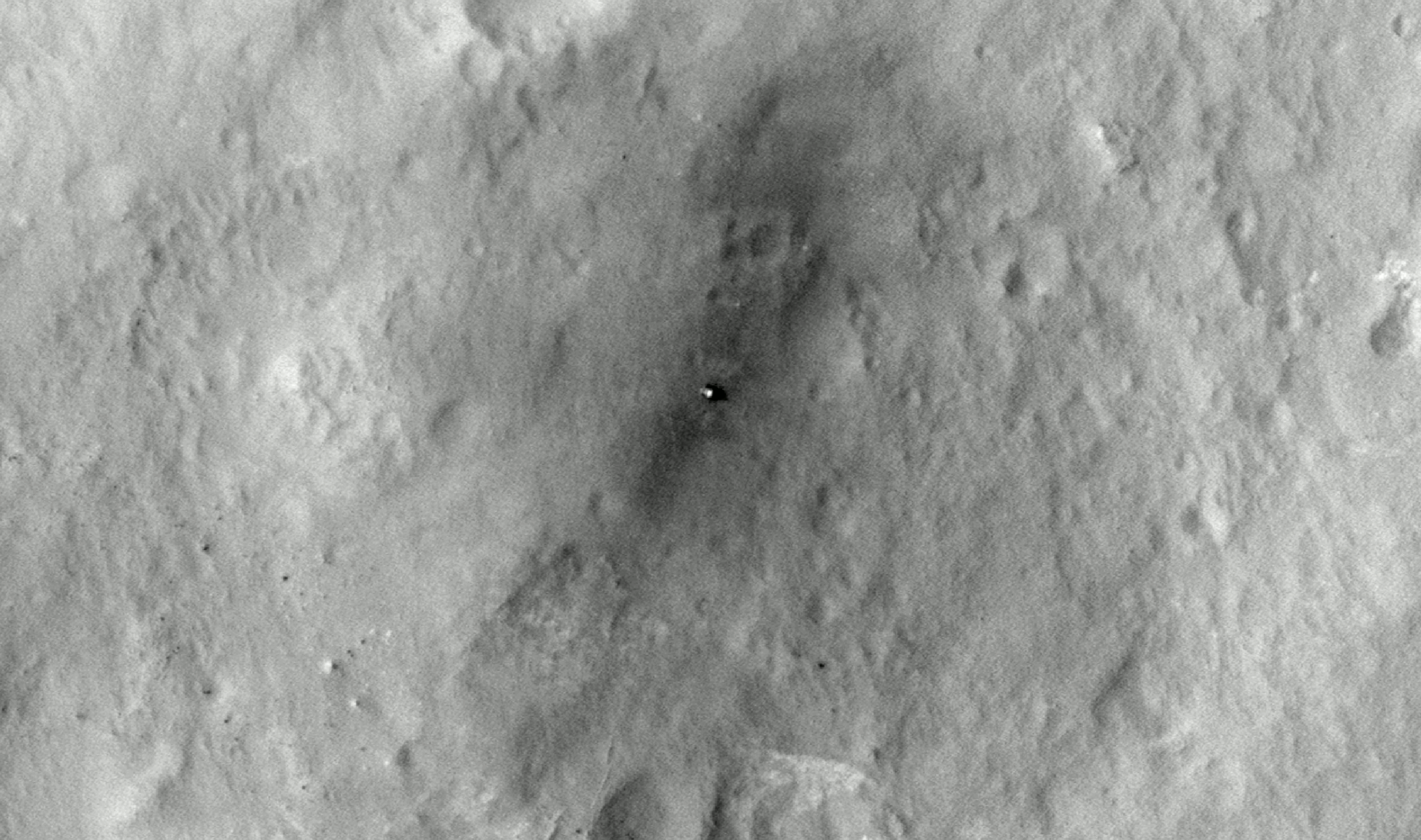 Subsequent images in these sequences are from HiRISE observations ESP_028401_1755, on Aug. 17, 2012; ESP_030313_1755, on Jan. 13, 2013; ESP_034572_1755, on Dec. 11, 2013; ESP_036128_1755, from April 2014; ESP_037117_1755, from June 27, 2014; and ESP_036128_1755, from February 2015. The two observations in 2014 did not include the heat shield location.