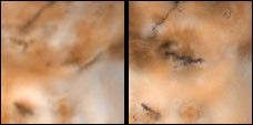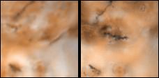 Detail of changes on Jupiter's moon Io in the region around Volund as seen by the Voyager 1 spacecraft in April 1979 (left frame) and NASA's Galileo spacecraft in September 1996 (right frame). North is to the top of both frames which are approximately 600 kilometers by 600 kilometers. Note the new linear feature, which may be a volcanic fissure, trending east from the southern end of Volund. Dark diffuse material lies to the west and a ring of bright material which may be SO2- rich plume deposits appears to be centered near the middle of the new linear feature.
