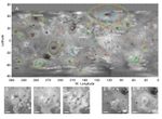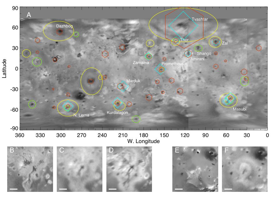 A: A global map of Jupiter's moon Io derived from eight images taken by the Long Range Reconnaissance Imager (LORRI) on the New Horizons spacecraft, as it passed Jupiter on its way to Pluto in late February 2007. Details as small as 12 kilometers (7 miles) are visible. The map shows the comprehensive picture of Io's volcanism obtained by New Horizons. Yellow ovals denote areas with new, faded or shifted plume deposits since the last images taken by the Galileo spacecraft in 2001. Green circles denote areas where probable new lava flows have occurred. Cyan diamonds indicate locations of active volcanic plumes, and orange hexagons are volcanic hot spots detected by the Linear Etalon Imaging Spectral Array (LEISA) instrument. For plumes and hot spots, symbol size indicates the approximate relative size and brightness of the features.