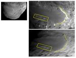 The smooth terrain is at a higher elevation than the more textured surface around it. Scientists think that cliffs, illustrated with yellow lines to the right, are being eroded back to the left in this view. The cliffs appear to have eroded as much as 20 to 30 meters (66 to 100 feet) in some places, since Deep Impact took the initial image. The box shows depressions that have merged together over time, also from erosion. This erosion is caused by volatile substances evaporating away from the comet.