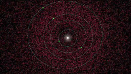 The movie begins by showing a simulated view of the estimated population before the NEOWISE survey, depicted in red. Each dot represents one asteroid. Object sizes are not to scale. At that time, the best models for the entire population, based on visible-light surveys, indicated roughly 36,000 members.