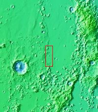 Bright windstreaks are located around several small craters at the top of this VIS image. The streaks indicate that the winds in this region are variable. There are streaks indicating winds blew from east to west, NNE to SSW, SW to NE and ESE to WNW. The brightest streaks are the E to W, which may indicate that they represent the most recent winds.