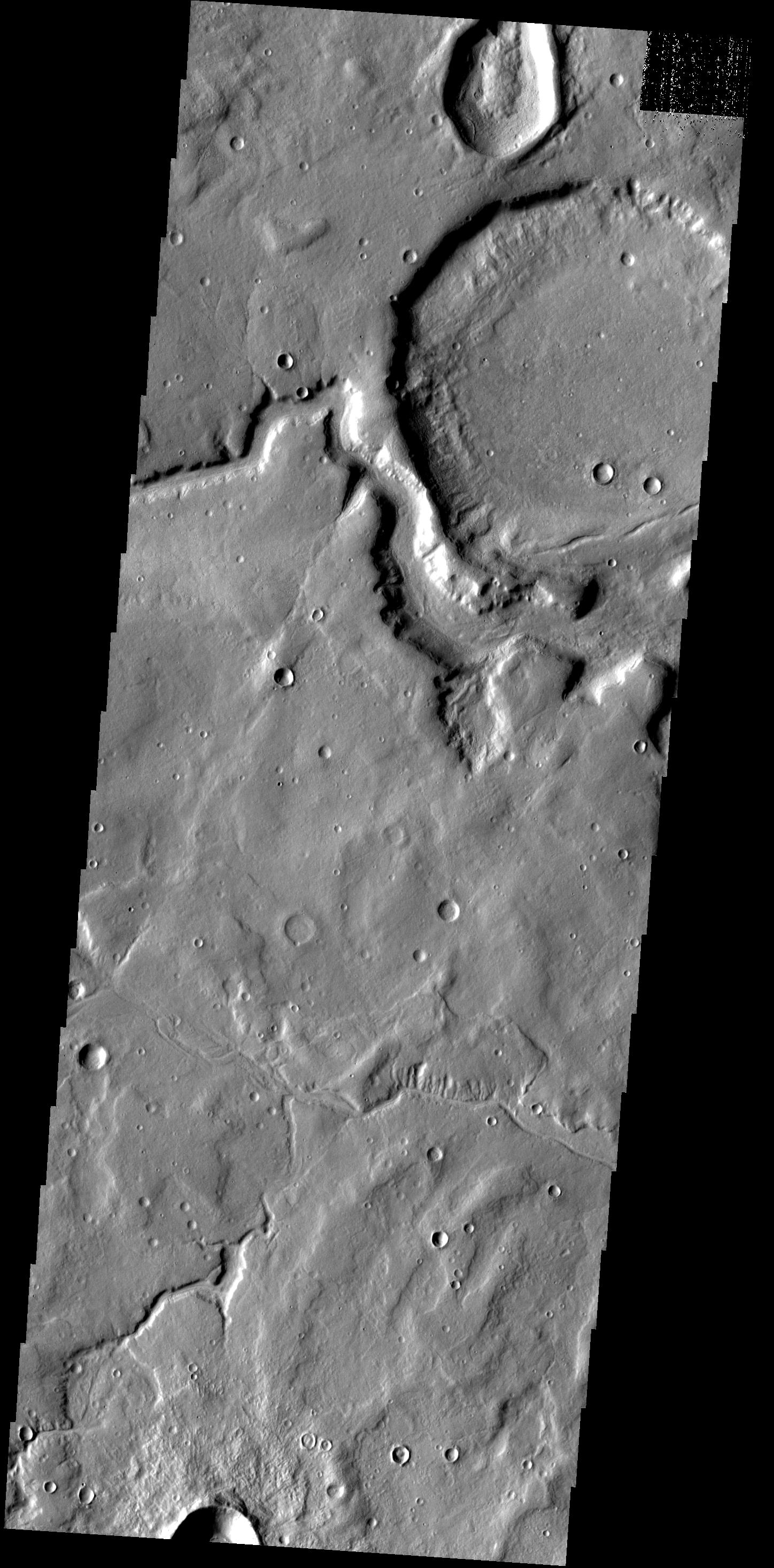 Note: this THEMIS visual image has not been radiometrically nor geometrically calibrated for this preliminary release. An empirical correction has been performed to remove instrumental effects. A linear shift has been applied in the cross-track and down-track direction to approximate spacecraft and planetary motion. Fully calibrated and geometrically projected images will be released through the Planetary Data System in accordance with Project policies at a later time.