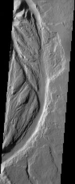 Streamlined channels near Lucus Planum. These features were formed by catastrophic floods in the Martian past.