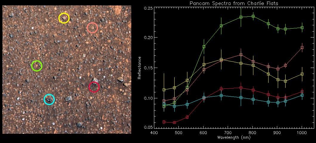 The chart above shows examples of spectra, or light wave patterns, extracted from the region of the Meridiani Planum rock outcrop dubbed "Charlie Flats," a rich science target for the Mars Exploration Rover Opportunity. The spectra were extracted from the similarly colored regions in the image on the left, taken by the rover's panoramic camera. The green circle identifies a bright, dust-like soil deposit. The red circle identifies a dark soil region. The yellow identifies a small, angular rock chip with a strong near-infrared band. The pink identifies a sphere-shaped pebble with a different strong near-infrared band. The cyan circle shows a dark, grayish pebble.